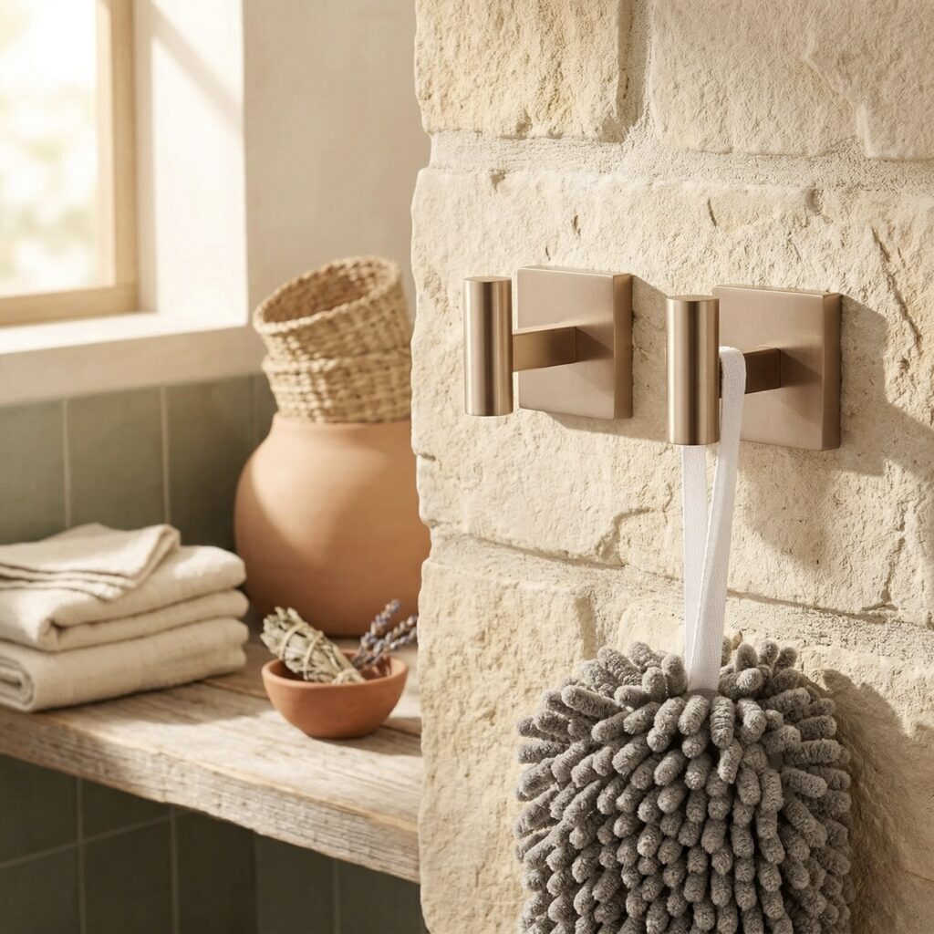 Brushed metal hooks styled with warm textured bathroom details.