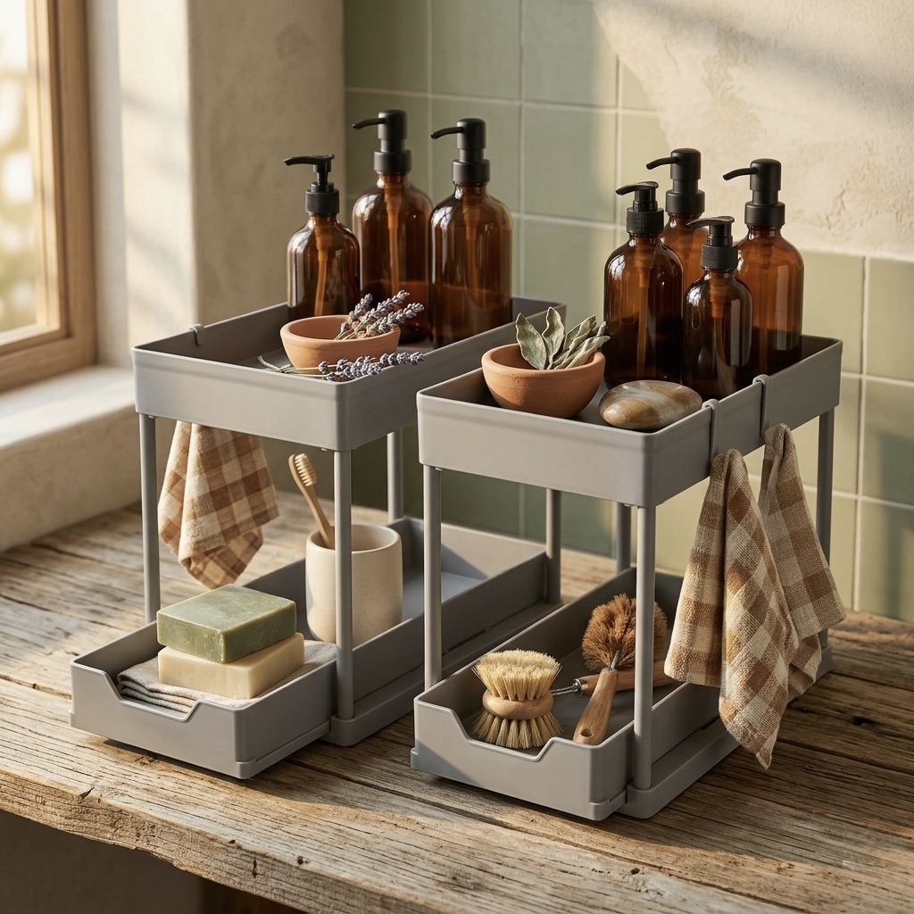 Layered storage trays styled with warm natural bathroom elements.