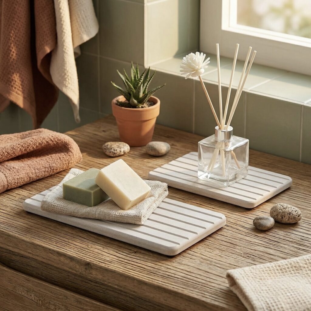 Stone trays styled with soaps and natural details.