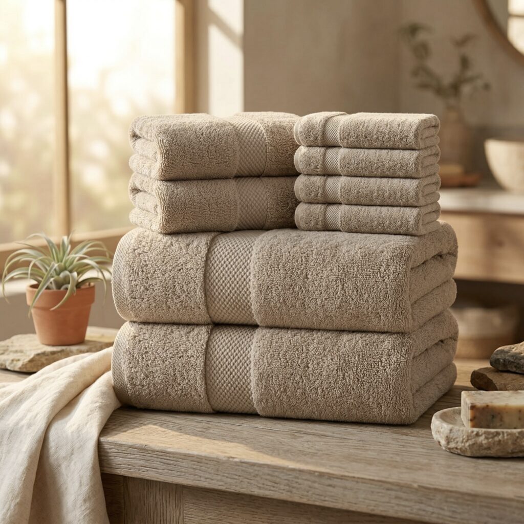 Soft organic cotton towels in warm neutral tones.