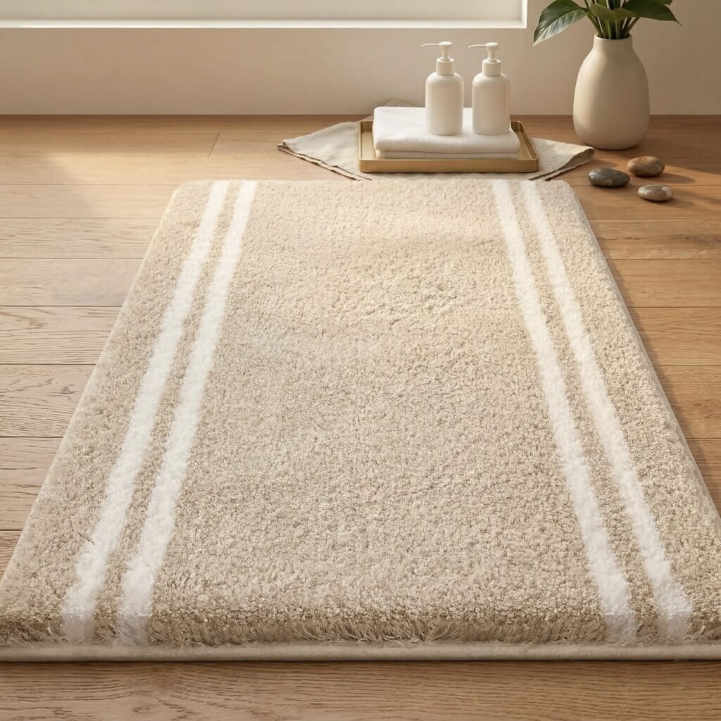Soft textured bath rug in warm neutral palette.