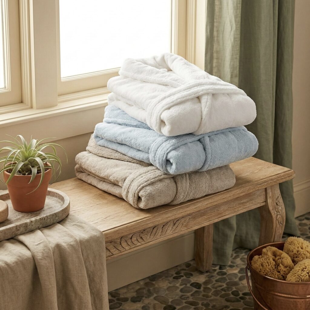 Plush bathrobes layered in soft neutral tones.
